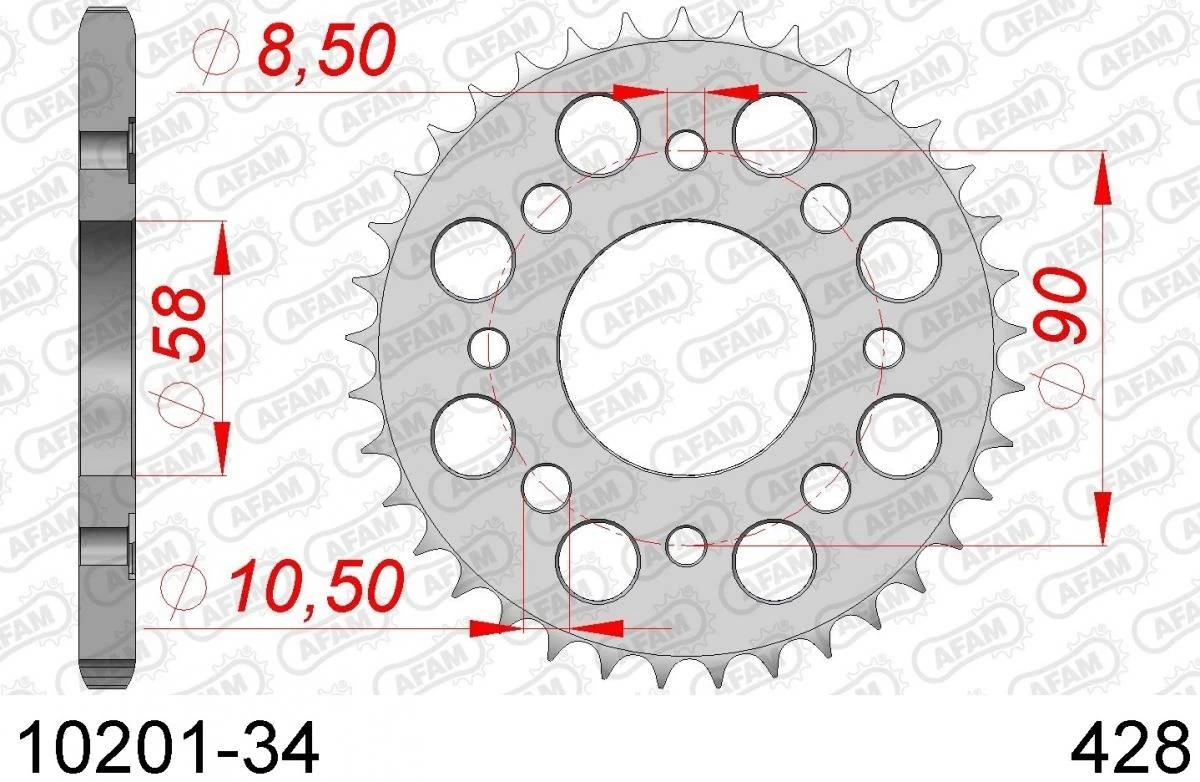 Een stalen 34 tands AFAM achtertandwiel. De tandwielen van AFAM zijn gemaakt van C45 staal met inductie geharde tanden, het tandprofiel is concentrisch, plat en perfect rond. Door deze samenstelling zijn de AFAM tandwielen perfect ter vervanging of zelfs ter verbetering van de OEM tandwielen.