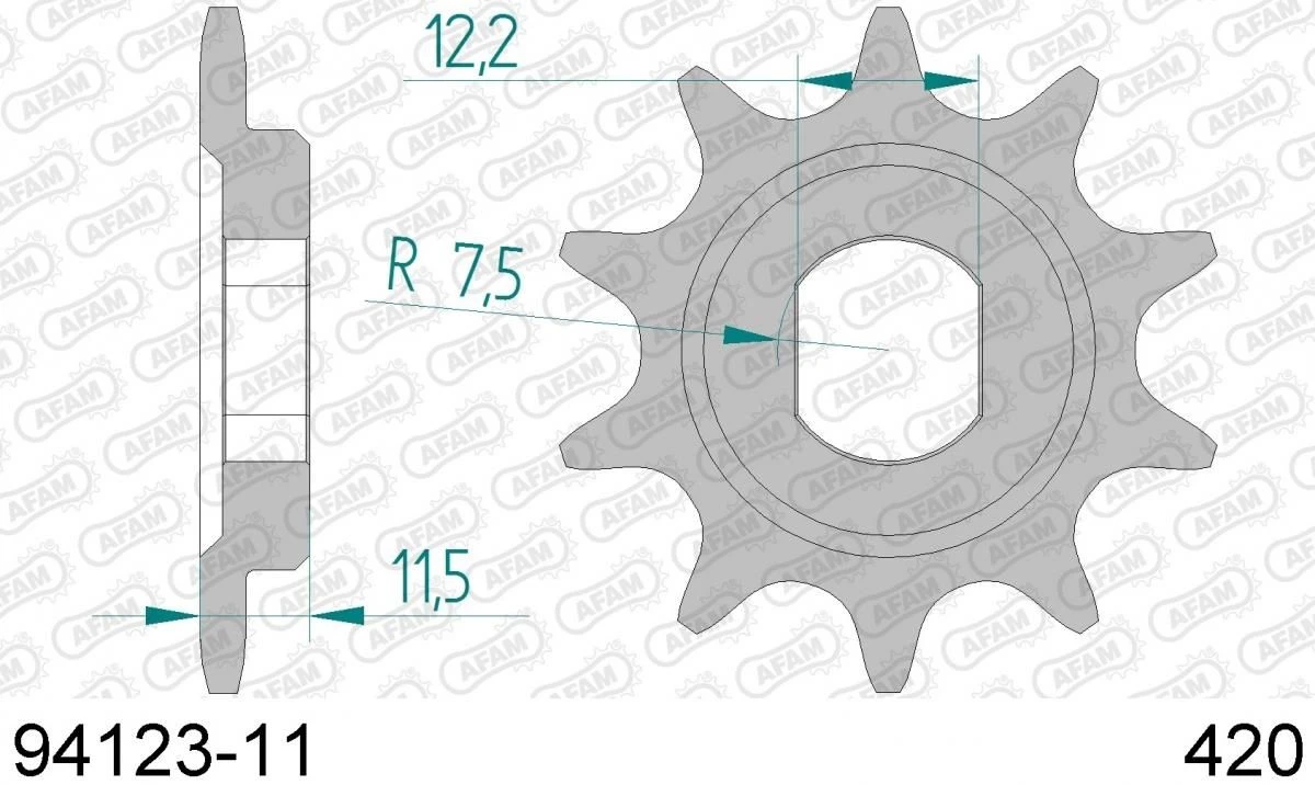 Een stalen 11 tands AFAM voortandwiel. De tandwielen van AFAM zijn gemaakt van C45 staal met inductie geharde tanden, het tandprofiel is concentrisch, plat en perfect rond. Door deze samenstelling zijn de AFAM tandwielen perfect ter vervanging of zelfs ter verbetering van de OEM tandwielen.