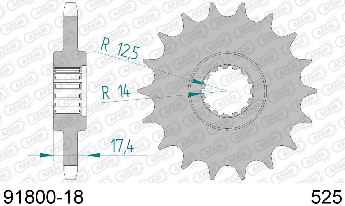 Een stalen 18 tands AFAM voortandwiel. De tandwielen van AFAM zijn gemaakt van C45 staal met inductie geharde tanden, het tandprofiel is concentrisch, plat en perfect rond. Door deze samenstelling zijn de AFAM tandwielen perfect ter vervanging of zelfs ter verbetering van de OEM tandwielen.
