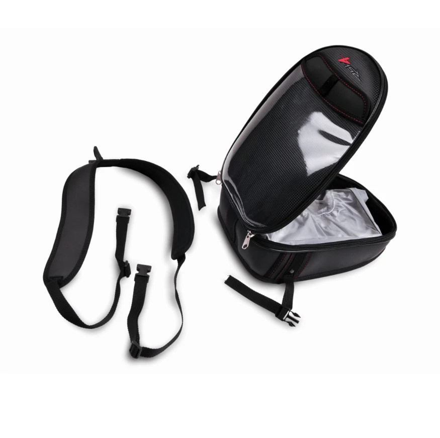 Tanktassen APRILIA ROAD. Van technisch materiaal met carbon-effect, laboratorium getest en goedgekeurd voor de bestendigheid tegen benzine, olie en uv-stralen, en op de weg en op de testbank om bij elke snelheid de ergonomie en de stabiliteit te waarborgen. De tas, met een inhoud van circa 3 liter, wordt met snel te ontgrendelen gespen aan de tankcover (met een gat zodat de demontage tijdens het tanken niet nodig is) bevestigd, is voorzien van een zak voor wegenkaarten aan de bovenkant, een regencover en in twee kleuren geborduurde RSV4-logo’s. De tas kan gemakkelijk worden vervoerd dankzij de handgreep en de schouderband. Kleur zwart.