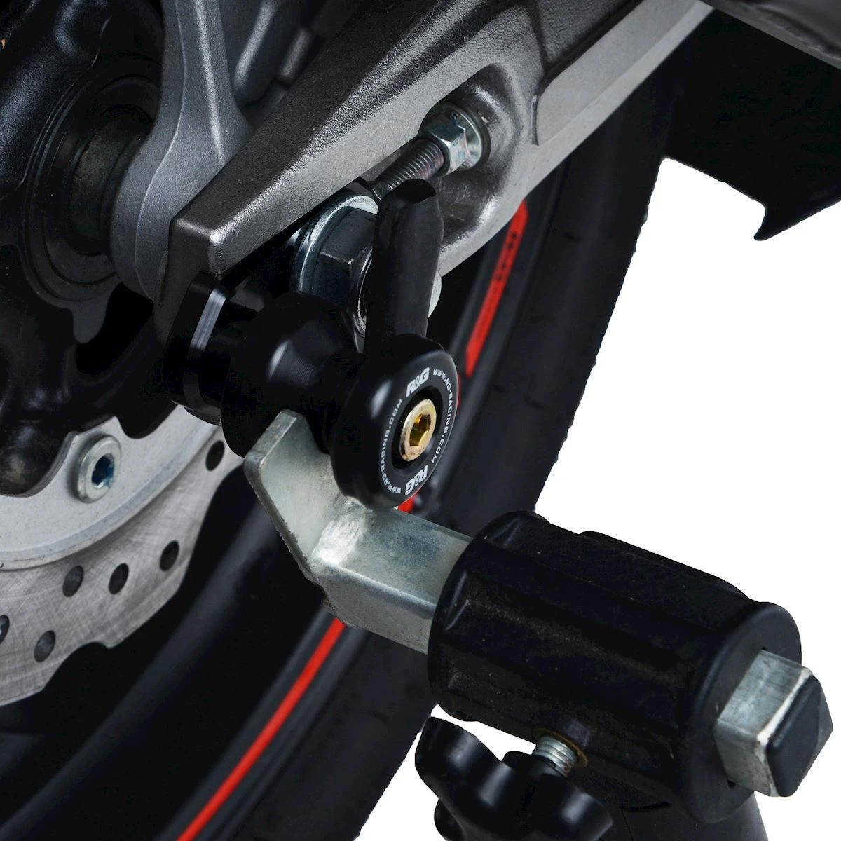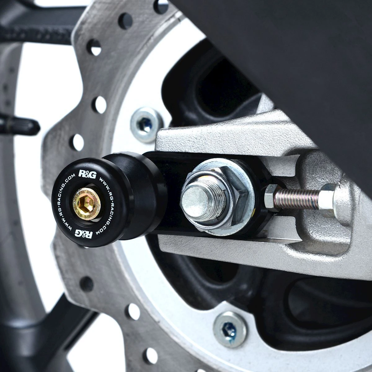 Wanneer er geen schroefdraad in de achterbrug is om een bobbin te monteren kan de R&G “Offset Cotton Reels” gebruikt worden. Zo kan er via de kettingspanner/achteras toch een bobbin op de motor gemonteerd worden en kan de motor dus met een paddockstand veilig en stevig gestald worden. Ook beschermen de bobbins de achterbrug bij een val.